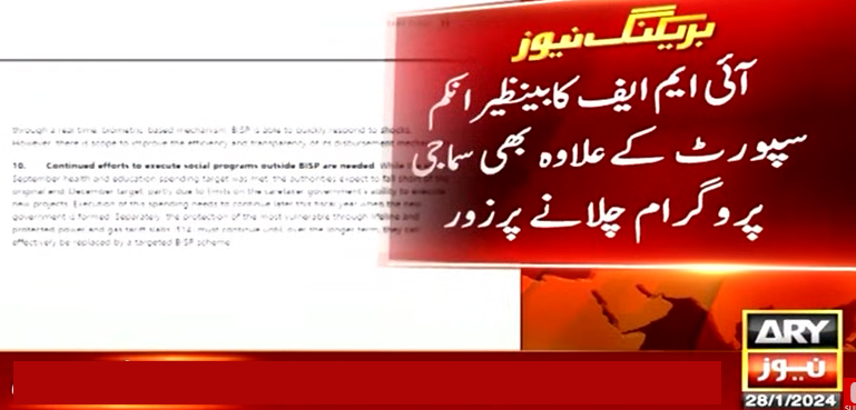 آئی ایم ایف کے مطابق رواں مالی سال ستمبر میں صحت اور تعلیم کے اخراجات کا ہدف پورا کر لیا گیا تاہم نگراں حکومت محدود صلاحیت کے باعث دسمبر کا ہدف پورا نہیں کر سکی۔ منتخب حکومت مالی سال کےآخرتک سماجی تحفظ کے اخراجات جاری رکھے۔