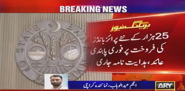 تفصیلات کے مطابق فنانس ڈویژن کی جانب سے جاری اعلامیے کے مطابق پچیس ہزار کے نئے پرائز بانڈز کی فروخت پر فوری پابندی عائد کردی گئی ہے، بانڈز کو اسپیشل سیونگز یا ڈیفنس سیونگ سرٹیفکیٹس میں تبدیل کرایا جاسکتا ہے۔