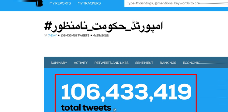 اسلام آباد : ‘دنیا بھر میں ٹویٹس ٹرینڈز کو مانیٹر کرنیوالے ٹویٹ بائنڈر کا کہنا ہے کہ ‘امپورٹڈ حکومت نامنظور’ ٹویٹرپر ابتک کا سب سے بڑا ٹرینڈ ہے۔