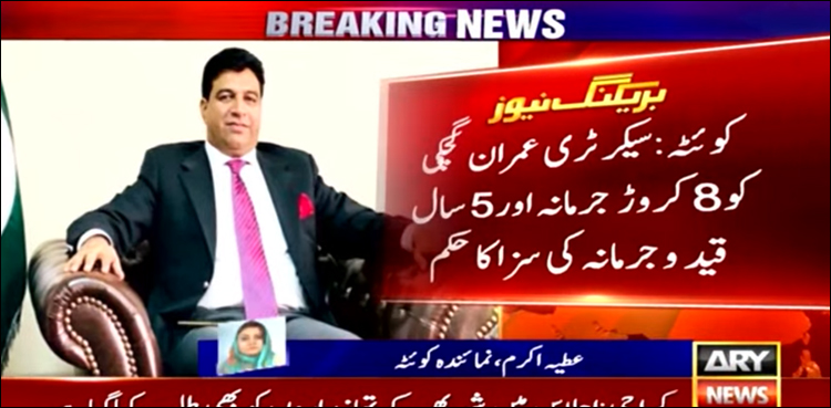 تفصیلات کے مطابق احتساب عدالت میں سابق سیکریٹری اسپورٹس عمران گچکی پر بد عنوانی کا جرم ثابت ہو گیا، عدالت نے گچکی کو 8 کروڑ روپے جرمانے اور 5 سال قید کی سزا کا حکم سنا دیا۔