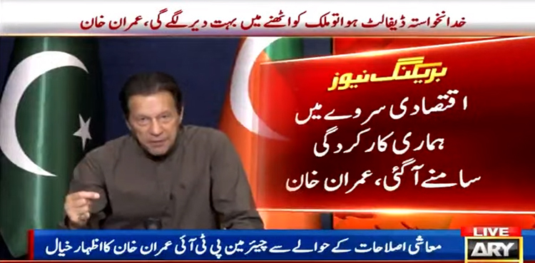 پاکستان تحریک انصاف کے دور حکومت میں کی گئی معاشی اصلاحات کے حوالے سے اظہار خیال کرتے ہوئے چیئرمین پی ٹی آئی عمران خان نے کہا کہ رواں مالی سال کے معاشی سروے کے اعدادوشمار سامنے آگئے ہیں، جس میں تصدیق کی گئی ہے کہ پاکستان گزشتہ 2 سال میں ترقی کررہا تھا ملک بہتری کی طرف جارہا تھا اور ملک کی دولت بڑھ رہی تھی۔