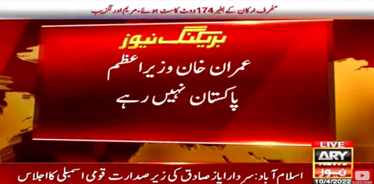 اے آر وائی نیوز کے مطابق عمران خان کے خلاف عدم اعتماد کامیاب ہوگئی جس کے بعد عمران خان وزیراعظم نہیں رہے، قومی اسمبلی میں عدم اعتماد کے حق میں 174 ووٹ ڈالے گئے ہیں۔