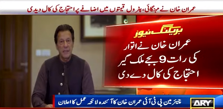 چیرمین تحریک انصاف عمران خان نے اتوار کو ملک گیر احتجاج کی کال دیتے ہوئے کہا کہ اس تماشے کے خاتمے کیلئے سب کو باہر نکلنا ہوگا ورنہ مزید مہنگائی ہوگی، اتوار کی رات 10 بجے قوم سے مخاطب ہوں گا، جس میں لائحہ عمل دینا چاہتا ہوں کہ ہمیں بحیثیت قوم کیا کرنا چاہیے، چاہتا ہوں پرامن احتجاج کیلئے سب اپنے شہروں میں نکلیں جس سے ان لوگوں کو پیغام جائے کہ ملک کو سنبھال نہیں سکتے تھے تو کیوں سازش کی گئی۔
