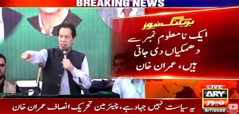 چیئرمین پی ٹی آئی عمران خان نے کہا ہے کہ ایک نامعلوم نمبر سے دھمکیاں دی جارہی ہیں اور خوفزدہ کرنے کی کوشش کی جارہی ہے۔