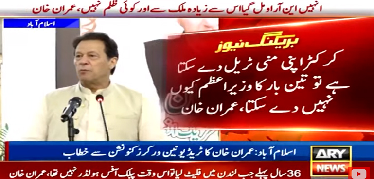 اے آر وائی نیوز کے مطابق پاکستان تحریک انصاف کے رہنما اور سابق وزیراعظم عمران خان نے اسلام آباد میں ٹریڈ یونین ورکرز کنونشن سے خطاب کرتے ہوئے کہا کہ نیب قانون میں ترمیم کے بعد انہیں ملک میں ڈاکا ڈالنے کا لائسنس دے دیا گیا ہے، اس قانون میں صرف چھوٹا چور پکڑا جائے گا بڑا نہیں، انہیں بری کر دیتے ہیں تو مطلب وائٹ کالر کرائم کو نہیں پکڑ سکتے، اس سے بڑی نا انصافی بنانا ری پبلک میں بھی نہیں ہے، غریب ممالک میں بھی ایسے قانون نہیں ہیں، جہاد کا مطلب ہے ظلم کے سامنے کھڑا ہونا اور میں اس ناانصافی کے خلاف اپنی قوم کو کال دے رہا ہوں۔