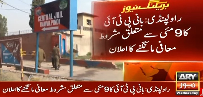 اے آر وائی نیوز کے مطابق بانی پی ٹی آئی عمران خان نے 9 مئی واقعات سے متعلق مشروط معافی مانگنے کا اعلان کرتے ہوئے ان واقعات کی سی سی ٹی وی فوٹیج سامنے لانے کی شرط عائد کی ہے۔