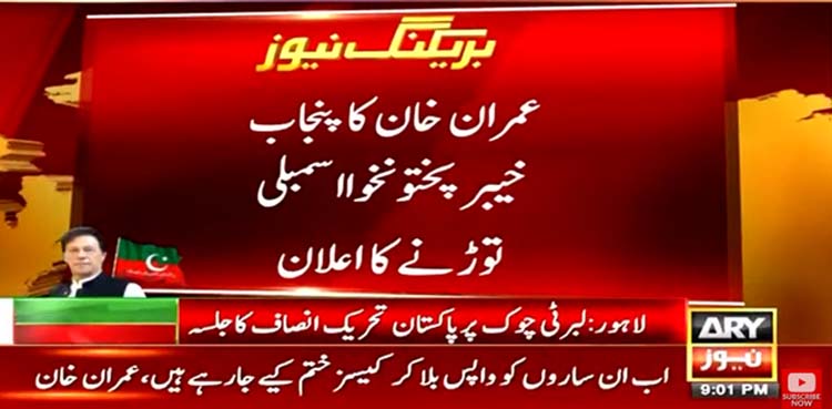 پاکستان تحریک انصاف کے چیئرمین عمران خان نے 23 دسمبرکو پنجاب اور خیبرپختونخوا اسمبلی تحلیل کرنے کا اعلان کردیا ہے۔
