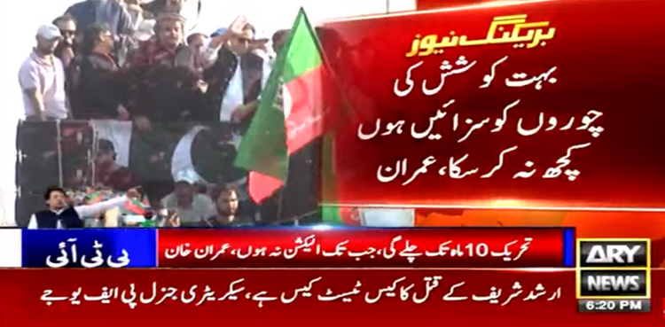 عمران خان نے کہا: ’اپنے دورِ حکومت میں نیب میرے ہاتھ میں نہیں تھا اور اسی لیے یہ سب بری ہوگئے۔ آج چھوٹا چور جیل میں اور بڑا ڈاکو بوٹ پالش کر کے وزیر اعظم بن گیا۔ بہت کوشش کی چوروں کو سزائیں ہوں مگر کچھ نہیں کر سکا۔‘