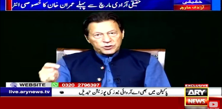اے آر وائی نیوز سے خصوصی گفتگو کرتے ہوئے چیئرمین پی ٹی آئی عمران خان نے کہا کہ ہم الیکشن کی تاریخ ملنے تک پیچھے نہیں ہٹیں گے، تحریک جاری رہے گی عوام سے کہتا ہوں کہ خوف کی زنجیریں توڑیں خوف غلام بنا دیتا ہے، جو لوگ ایمان لے آتے ہیں اللہ ان کا خوف دورکردیتا ہے۔