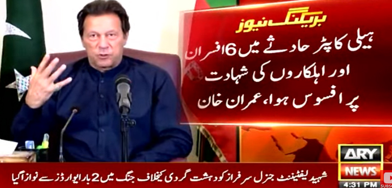 عمران خان نے اپنے ٹوئٹ میں لکھا ہے کہ ہیلی کاپٹر حادثے اور اس میں سوار تمام 6 افراد کی شہادت پر افسوس ہوا۔ شہدا کے اہل خانہ کے ساتھ دعائیں ہیں اور ان سے تعزیت کرتا ہوں۔