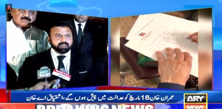 اشتیاق اے خان کا کہنا تھا کہ عمران خان 18 مارچ کو عدالت میں پیش ہوں گے، عمران خان نے ملاقات میں اٹھارہ مارچ کو عدالت میں پیش ہونے کی تحریری یقین دہانی کرائی ہے، یہ حلف نامہ میں لیکر سی سی پی او کے پیش کرنے آیا انہوں نے ملنے سے انکار کردیا