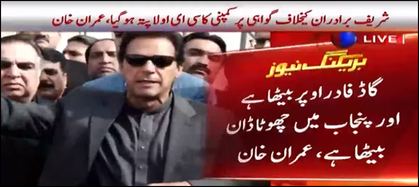 عمران خان کا کہنا تھا کہ دونوں بھائی مال بنانے میں لگے ہیں ، ایک بھائی وفاق اور ایک صوبائی سطح پر مال بنارہاہے، ملتان میٹرو کا کنٹریکٹ دے کر پیسہ بنایا گیا، نوازشریف کے بعد شہبازشریف بھی پکڑے گئے ہیں، شریف برادران کے خلاف گواہی دینے پر کمپنی کاسی ای او ہی لاپتہ ہوگیا ہے۔
