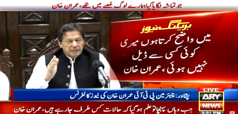 اے آر وائی نیوز کے مطابق پی ٹی آئی چیئرمین اور سابق وزیراعظم عمران خان نے پشاور میں پریس کانفرنس کرتے ہوئے واضح کیا ہے کہ میری اسٹیبلشمنٹ سمیت کسی سے کوئی ڈیل نہیں ہوئی، اگر میں اس دن شام کو اسلام آباد میں بیٹھ جاتا تو خون خرابہ ہوجاتا۔