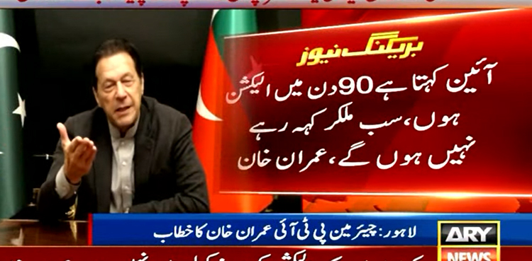 چیئرمین پی ٹی آئی نے کہا کہ جمہوریت وہ ہوتی ہے جو قانون کے برابر سب کوایک کردے، آئین کہتا ہے 90 دن میں الیکشن ہونے ہیں،یہ سب ملکرکہہ رہے ہیں کہ الیکشن نہیں ہوں گے، کہا جا رہا ہے کہ الیکشن کرانےکیلئے پیسے نہیں ہیں۔