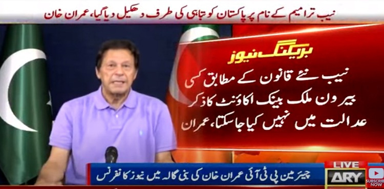 چیئرمین پی ٹی آئی عمران خان نے بنی گالہ میں نیوز کانفرنس کرتے ہوئے کہا کہ نیب قانون میں ترامیم کے نام پر پاکستان کو تباہی کی طرف دھکیل دیا گیا، ان کے ذہن میں معیشت تھی نہ مہنگائی تھی اور نہ ہی انہوں نے ملکی معیشت ٹھیک کرنے اور مہنگائی کو کنٹرول کرنے کیلئے کوئی تیاری کی تھی، ان کے ذہن میں بس یہ تھا کہ کیسے این آر او ٹو لینا ہے۔