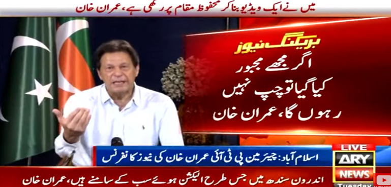 عمران خان نے کہا کہ مجھ سمیت ساری قیادت پر دہشت گردی کی دفعات کے تحت مقدمے ہیں، مقدمات اس لیے درج کیے جا رہے ہیں کہ ہم خاموش رہیں، میں نے ایک ویڈیو بنائی ہوئی ہے جس میں ہے کہ کس نے سازش میں کیا کیا کردار ادا کیا یہ ویڈیو محفوظ مقام پر ہے اگر مجھے کچھ ہوا تو وہ سامنے آجائے گی۔