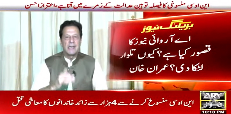 نجی نیوز چینل کو انٹرویو دیتے ہوئے عمران خان نے کہا کہ اے آر وائی نیوز کا قصور کیا ہے؟ کیوں تلوار لٹکا دی ہے؟ کیوں سختی کی جا رہی ہے؟ کیوں نشریات روکی جا رہی ہیں؟