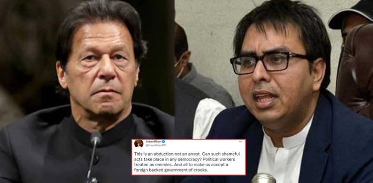 سماجی رابطے کی ویب سائٹ ٹویٹر پر سابق وزیراعظم عمران خان نے ردعمل دیتے ہوئے لکھا کہ یہ اغوا ہے گرفتاری نہیں کیا ایسی شرمناک حرکتیں کسی جمہوریت میں ہوسکتی ہیں۔