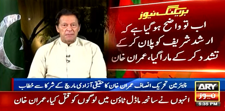 وزیر آباد میں حقیقی آزادی مارچ کے شرکا سے ویڈیو لنک کے ذریعے خطاب میں عمران خان نے کہا کہ واضح ہوگیا کہ ارشد شریف کو پلان کر کے تشدد اور پھر قتل کیا گیا، ٹی وی اینکر نے جو ارشد شریف کی تصاویر دکھائی وہ کس طرح ان کے پاس آئیں۔