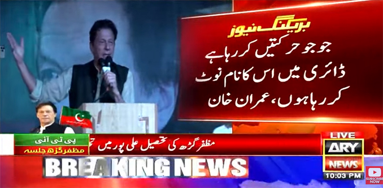 مظفرگڑھ میں پی ٹی آئی کے انتخابی جلسے سے خطاب کرتے ہوئے عمران خان نے کہا کہ لاہور میں مسٹر ایکس بیٹھا ہے جو چوروں کو جتانےکی کوشش کر رہا ہے جوجوحرکتیں کی جارہی ہیں ڈائری میں اس کانام نوٹ کررہاہوں جس جس نےپاکستان کا قانون توڑا اس بار اس کا کڑا احتساب ہوگا آپ کوئی بھی ہتھکنڈا استعمال کرکےدیکھ لیں شکست ہو گی۔