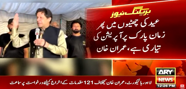 پاکستان تحریک انصاف کے چیئرمین عمران خان نے کہا ہے کہ میرے پاس اطلاعات ہیں کہ یہ عید کی چھٹیوں میں پھر زمان پارک میں آپریشن کریں گے۔