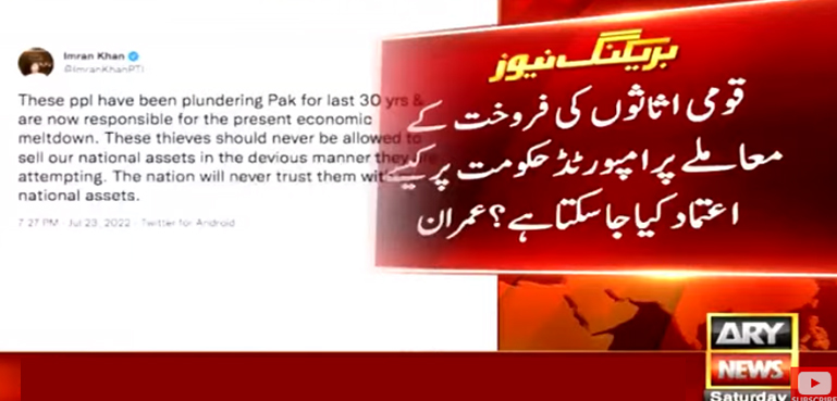 عمران خان نے اپنے ٹوئٹ میں سوال اٹھایا ہے کہ قومی اثاثوں کی فروخت کے معاملے پر امپورٹڈ حکومت پر کیسے اعتماد کیا جا سکتا ہے؟ قومی اثاثوں کی فروخت پر طریقہ کار اور قانونی جانچ پڑتال کیسے نظر انداز ہوسکتی ہے؟