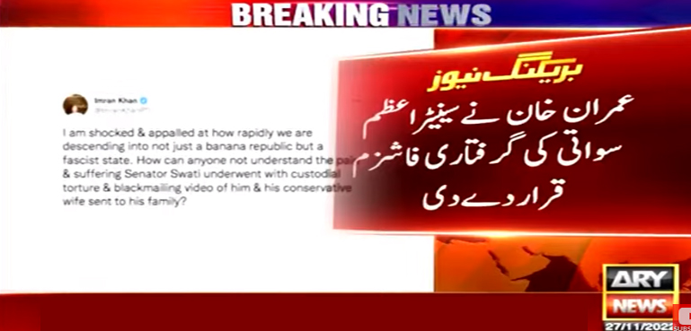 عمران خان نے کہا کہ ناانصافی پر اعظم سواتی نے ٹوئٹ کیا اور دوبارہ گرفتار ہو گئے۔ حیران ہوں تیزی سے نہ صرف بنانا ری پبلک بلکہ ایک فاشسٹ ریاست کی جانب بڑھتے جا رہے ہیں۔ اس ریاستی فاشزم کے خلاف سب کو آواز اٹھانی ہوگی۔