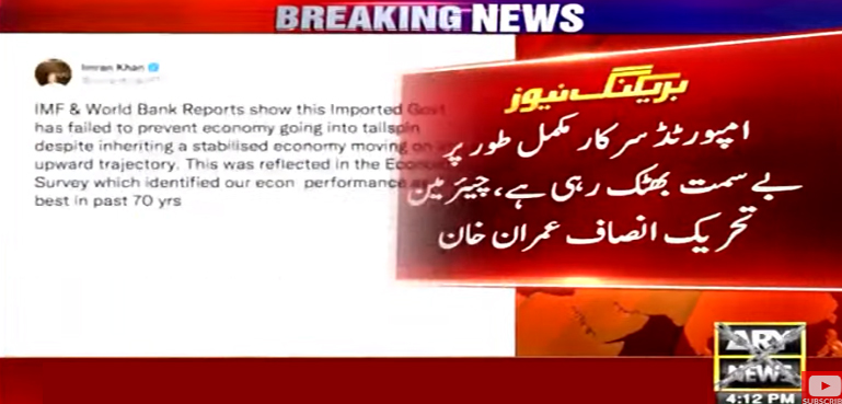 عمران خان نے سماجی رابطوں کی ویب سائٹ ٹوئٹر پر موجودہ حکومت کو کڑی تنقید کا نشانہ بناتے ہوئے آئی ایم ایف اور عالمی بینک رپورٹس ہیں کہ پاکستان کی معیشت بلندی کی جانب جا رہی تھی، لیکن موجودہ حکومت مستحکم ہوتی معیشت کو تباہی کے گھڑے میں گرنے سے بچانے میں ناکام رہی۔