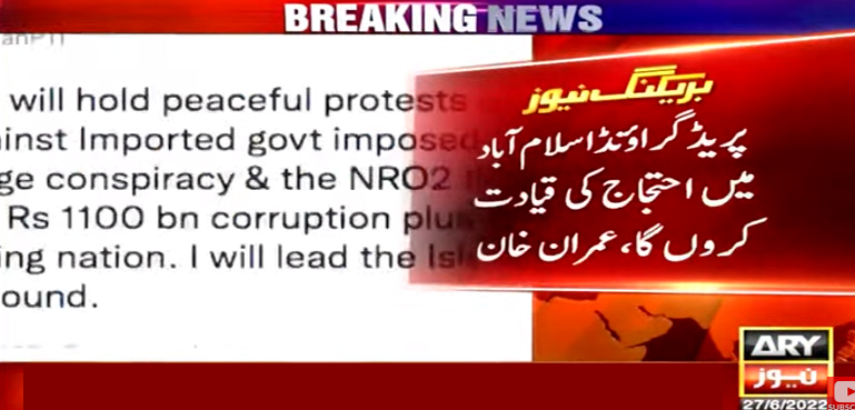 پاکستان تحریک انصاف کے سربراہ اور سابق وزیراعظم عمران خان نے سماجی رابطوں کی ویب سائٹ ٹوئٹ پر اپنے ٹوئٹ میٰں کہا ہے کہ 2 جولائی کو ہم امپورٹڈ حکومت کے خلاف احتجاج کریں گے اور میں پریڈ گراؤنڈ اسلام آباد میں ہونے والے احتجاج کی قیادت کروں گا۔