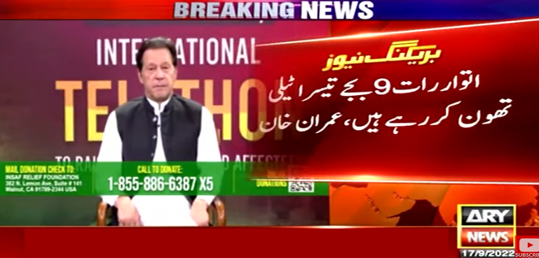 اے آر وائی نیوز کے مطابق عمران خان نے سیلاب متاثرین کی امداد کے لیے تیسرے ٹیلی تھون کے حوالے سے قوم کو ویڈیو پیغام دیتے ہوئے کہا ہے کہ اتوار کی رات 9 بجے ہم تیسرا ٹیلی تھون کر رہے ہیں، ہم ملک بھر کے سیلاب متاثرین کے لیے پیسہ اکٹھا کر رہے ہیں اور میں چاہتا ہوں کہ آپ سب بھرپور طریقے سے اس میں شرکت کریں۔