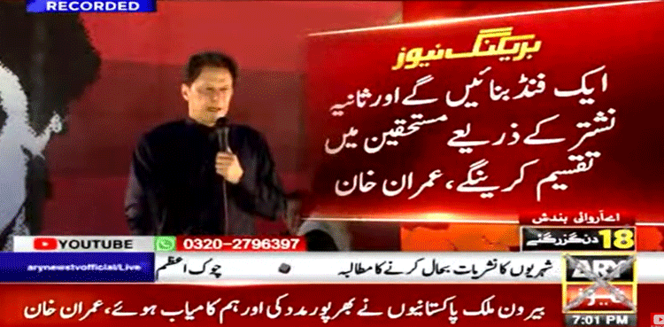 جلسے سے خطاب کرتے ہوئے عمران خان نے کہا کہ پیر کے روز سیلاب متاثرین کے لئے ٹیلی تھون کرونگا اور ان کے لئے فنڈز جمع کرونگا۔