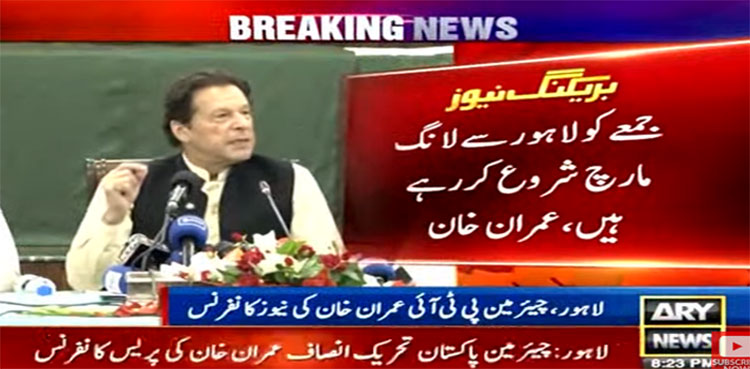 تفصیلات کے مطابق لاہور میں نیوز کانفرنس کے دوران عمران خان نے اعلان کیا کہ جمعے سے لانگ مارچ کرنے جارہے ہیں، لانگ مارچ کا آغاز لبرٹی چوک لاہور سے ہوگا، گیارہ بجے ہم جمع ہونگے جس کی قیادت میں خود کرونگا۔