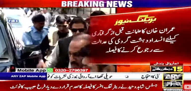 عمران خان نے دہشتگردی ایکٹ کے تحت درج مقدمے میں ضمانت قبل از گرفتاری کیلیے انسداد دہشتگردی عدالت سے رجوع کرنیکا فیصلہ کیا گیا ہے۔