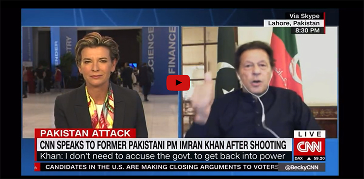 سابق وزیراعظم وچیئرمین پی ٹی آئی عمران خان نے امریکی نشریاتی ادارے کو انٹرویو دیتے ہوئے کہا کہ میرے پر حملے کی منصوبہ بندی 2 ماہ پہلے ہوئی تھی عوام میں گیا تو 24 ستمبر کو حملےسےمتعلق انکشاف کیا تھا جب میری حکومت گرائی گئی مجھےقتل کرنےکی منصوبہ بندی بنائی گئی یہ سمجھا جا رہا تھا مجھے راستے سے ہٹایا گیا تو میری پارٹی بکھر جائےگی۔