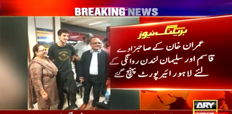 تفصیلات کےمطابق چیئرمین تحریک انصاف عمران خان کے صاحبزادے قاسم اور سلیمان لندن روانگی کیلئے لاہور ائیرپورٹ پہنچے۔