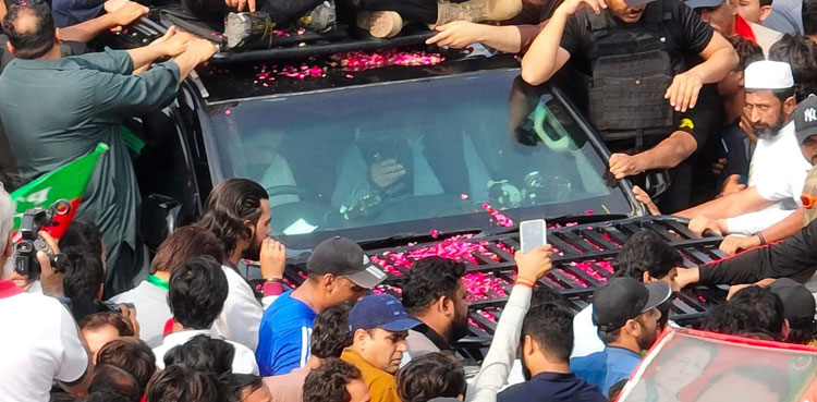 چیئرمین تحریک انصاف عمران خان کا قافلہ اپنی منزل ناصر باغ پہنچا، کارکنان اپنے قائد کی ہدایت پر پیدل مارچ کرتے ہوئے ریلی میں شامل ہوئے، مرد و خواتین اور بوڑھے بھی ریلی کا حصہ بنے، ریلی مقررہ راستوں سے ہوتے ہوئے ناصر باغ پہنچی۔