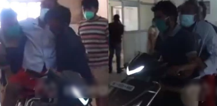 غیرملکی خبررساں ادارے کی رپورٹ کے مطابق بھارت میں کورونا کے ممکنہ مریض کو اسپتال کے انتہائی نگہداشت وارڈ(آئی سی یو) سے ایمبولنس تک لے جانے کے لیے مریض کو اسکوٹی پر بٹھایا گیا۔