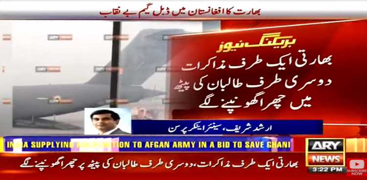اطلاعات کے مطابق سفارتی عملےکےانخلاکےنام پر دوبھارتی سی17 طیاروں کی افغانستان آمد ہوئی،طیارے بظاہر اپنےعملےکو لینےآئےلیکن درحقیقت دونوں اسلحے سے بھرے ہوئے تھے یہ طیارے افغانستان میں اسلحےکی بڑی کھیپ اتار کر آئے، بھارتی طیاروں میں لایا گیا اسلحہ افغان طالبان کےخلاف استعمال ہوناہے۔
