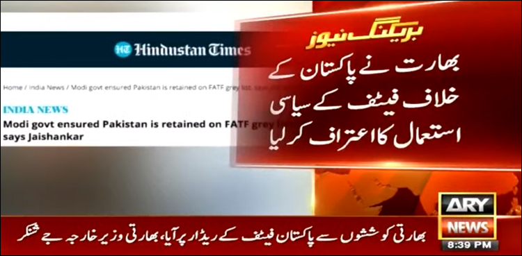 بھارتی میڈیا رپورٹ کے مطابق وزیر خارجہ جے شنکر نے اعتراف کیا کہ ’بھارت کی کوشش سے پاکستان فیٹف کی گرے لسٹ میں رہا، ہماری ہی کوششوں سے پاکستان فیٹف کے ریڈار پر آیا‘۔