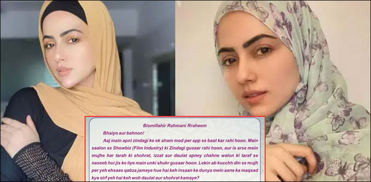 ثناءخان نے ایک اہم اعلان کرتے ہوئے لکھا کہ ’وہ شوبز انڈسٹری چھوڑ کر اپنی تمام زندگی انسانیت کے خدمت پر وقف کریں گی اور وہ اللّہ تعالیٰ کے حکم پر چلنے کا پکّا ارادہ کر رہی ہیں‘۔