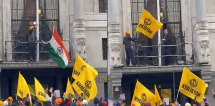 سوشل میڈیا پر وائرل فوٹیج میں سکھ نوجوانوں کو بھارتی ہائی کمیشن سے ترنگا اتار کر خالصتان کا جھنڈا لگاتے دیکھا جا سکتا ہے۔