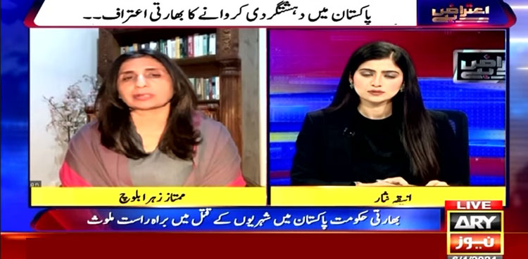 اے آر وائی کے پروگرام اعتراض میں گفتگو کرتے ہوئے ممتاز زہرہ بلوچ کا کہنا تھا کہ پاکستان بھارت کا اصل چہرہ کافی عرصے سے دنیا کو دکھا رہا تھا، بھارتی قیادت کے حالیہ بیانات سے دنیا کے سامنےان کا مکروہ چہرہ بےنقاب ہوچکا ہے۔ پاکستان کی سلامتی پر سمجھوتہ نہیں کیا جائےگا۔