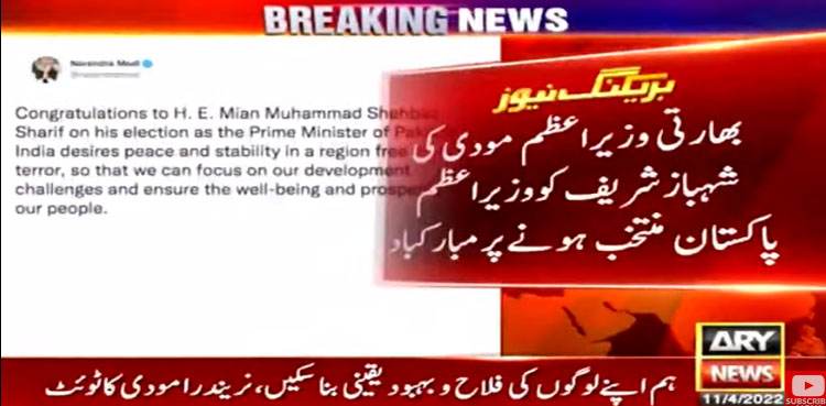 تفصیلات کے مطابق بھارتی وزیراعظم نریندر مودی نے سماجی رابطے کی ویب سائٹ ٹویٹر پر نومنتخب وزیراعظم شہباز شریف کو مبارک باد پیش کی۔