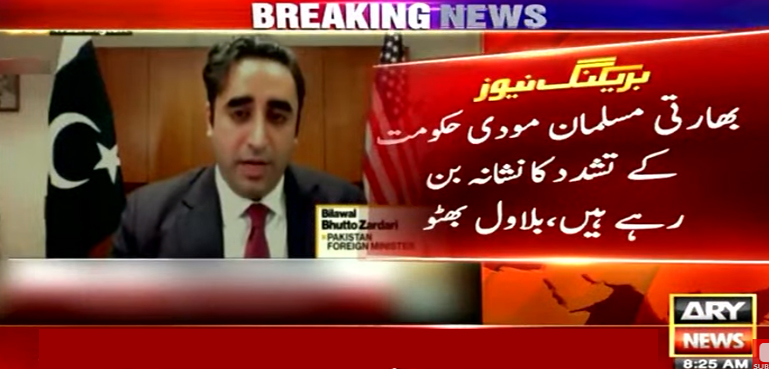 اے آر وائی نیوز کے مطابق وزیر خارجہ بلاول بھٹو زرداری جو ان دنوں امریکا کے دورے پر ہیں۔ انہوں نے ایک امریکی ٹی وی کو انٹرویو دیتے ہوئے ایک بار پھر بھارتی وزیر اعظم کو نشانے پر رکھا اور مودی کو گجرات کا قصائی کہنے کے بیان کا دفاع کیا۔