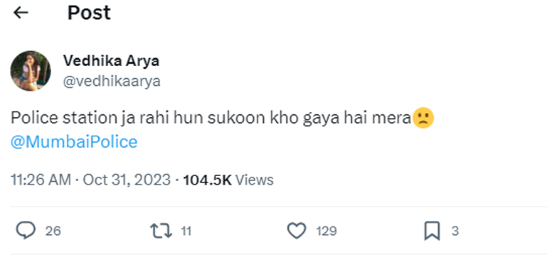 سماجی رابطوں کی ویب سائٹ ایکس (ٹوئٹر) پر ایک ویدھیکا آریا نامی بھارتی خاتون نے ایک دلچسپ پوسٹ کی جس میں انہوں نے ممبئی پولیس کو ٹیگ کرتے ہوئے اس سے سکون ڈھونڈنے کی انوکھی درخواست کی ہے۔
