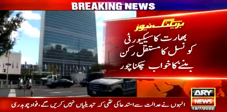 اسلام آباد: بھارت کا سکیورٹی کونسل کا مستقل رکن بننے کا خواب چکنا چور ہوگیا۔ اقوام متحدہ میں مستقل ممبر کے لیے پاکستان کے مؤقف کو تسلیم کر لیا گیا۔