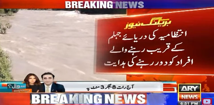 ڈائریکٹر ایس ڈی ایم اے کا کہنا ہے کہ مقبوضہ کشمیر کے ایک بند سے پانی چھوڑا گیا ہے، دریائے جہلم کے دو میل کے مقام پر 22 ہزار کیوسک کا ریلا گزر رہا ہے۔