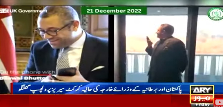 اے آر وائی نیوز کے مطابق وزیر خارجہ بلاول بھٹو زرداری جو ان دنوں امریکا کے دورے پر ہیں اور کئی عالمی رہنماؤں سے ملاقاتیں کر رہے ہیں ان کا گزشتہ روز اپنے برطانوی ہم منصب جیمز کلیورلی سے ٹیلیفونک رابطہ ہوا جس میں دونوں کے درمیان حال ہی میں پاکستان میں دونوں ممالک کے درمیان کھیلی گئی ٹیسٹ سیریز پر دلچسپ گفتگو ہوئی۔