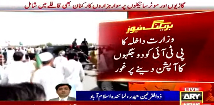 اسلام آباد : وزارت داخلہ نے حقیقی آزادی مارچ کیلئے تحریک انصاف کو 2 جگہوں کا آپشن دینے پر غور شروع کردیا، ایف 9 پارک اور پریڈ گراؤنڈ پر جلسے کی اجازت دی جاسکتی ہے۔