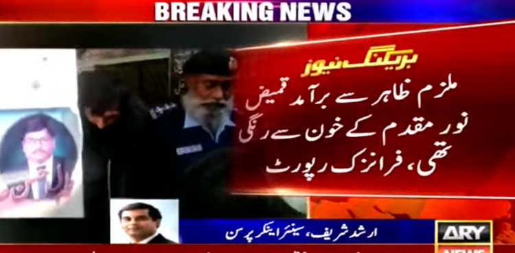فرانزک رپورٹ میں بتایا گیا کہ قتل کے وقت ملزم ظاہرکی پہنی قمیض بھی برآمدکی گئی، ملزم ظاہر سے برآمد قمیض نور مقدم کےخون سےرنگی تھی جبکہ نور مقدم کا ڈی این اے ظاہر جعفر کی قمیض سے ملا۔